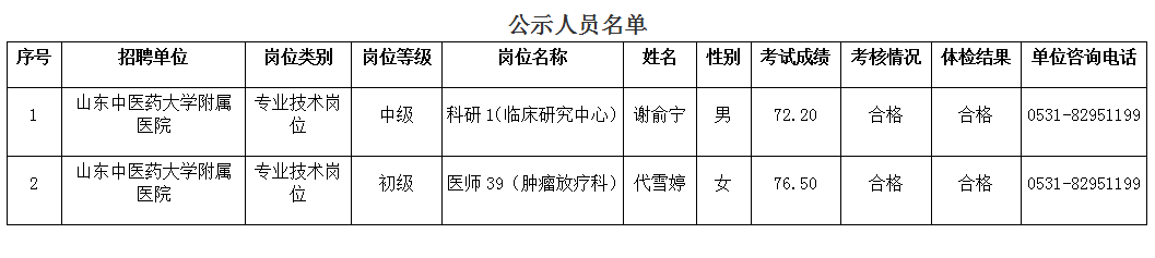 山东中医药大学附属医院2025年公开招聘拟聘用人员公示名单